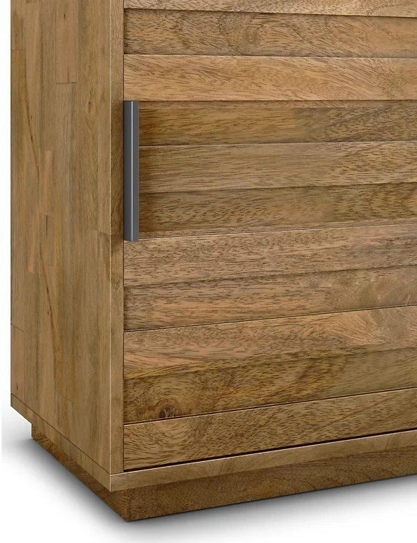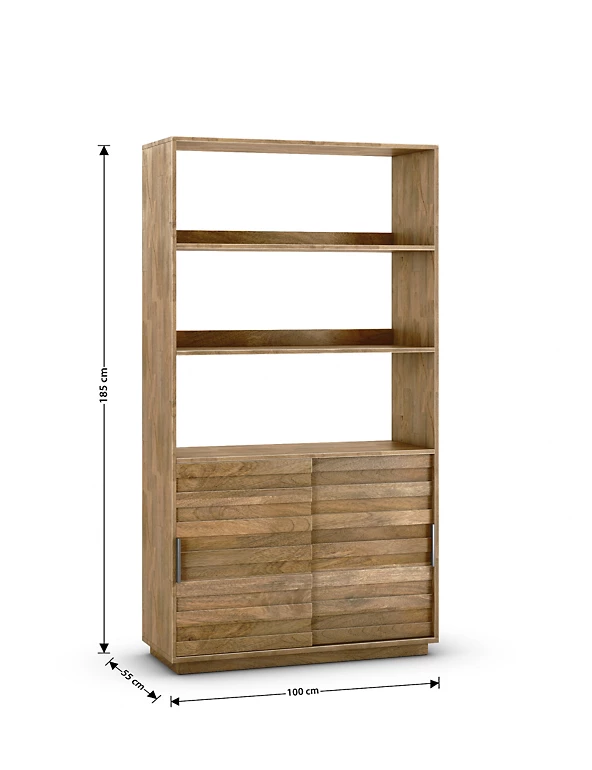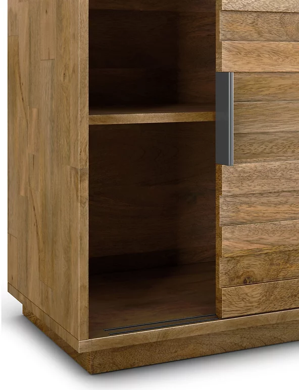 Solid Mango wood is hard wearing and strong, the perfect choice of material for this display cabinet from our Groove range. The practical design features three open shelves above an intrinsic cabinet, the two sliding doors have an exquisitely detailed finish, whilst the natural warm colours will provide a timeless charm to your home.