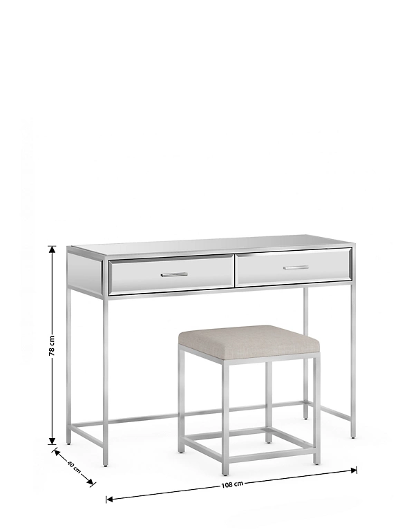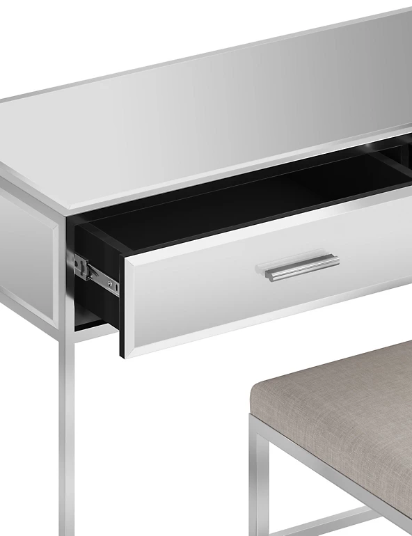 We can’t think of a better place to get ready than at this Skylar mirrored metal dressing table. The clean lines and reflective high-shine finish work well in both modern and classic spaces. There are two drawers with plenty of room for your everyday essentials, plus a matching stool with a comfortable upholstered seat. Matching items are available in this range.