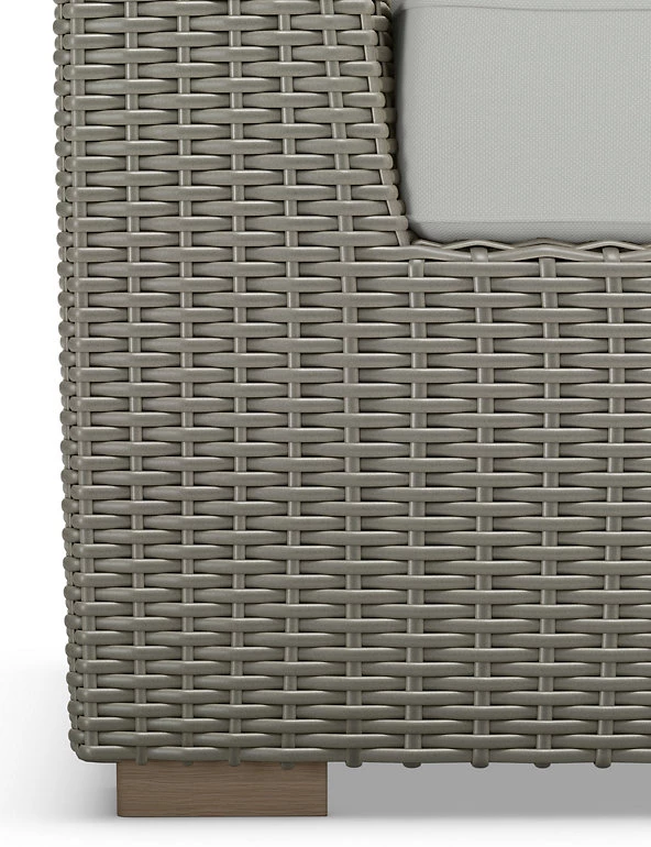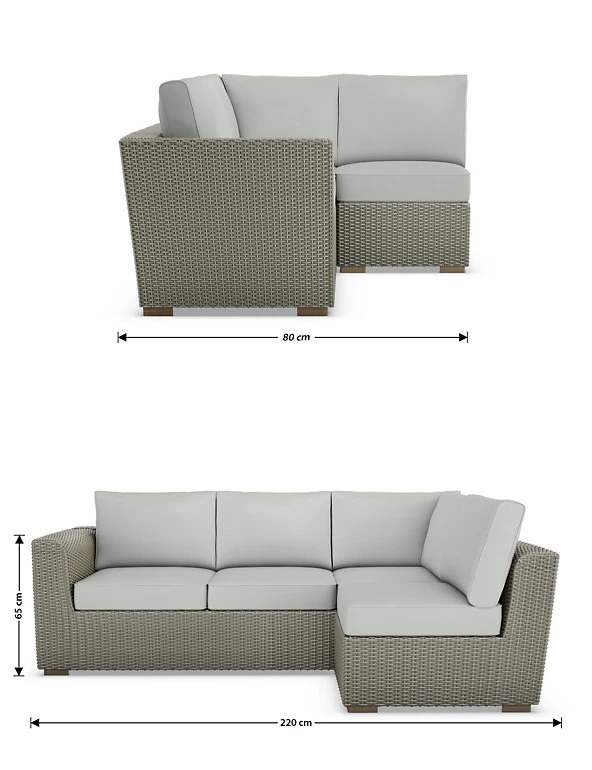 The corner sofa is a stylish, economical and practical addition to any outdoor space, making it perfect for entertaining friends and family. The comfortable curves of this plush, contemporary Marlow corner sofa look stylish alongside any outdoor décor, with neutral grey tones complementing both lighter and darker styles. The synthetic rattan is hardy and weatherproof, and this outdoor sofa comes with cosy, matching water-repellent cushions. This is the perfect piece to place in the corner of your veranda for a shady summer get-together, or, with its durable properties, you could even leave it under the sunlight without the risk of weathering. This corner unit comes in a three seater and an attachable chaise module that can make your corner sofa either left or right handed.