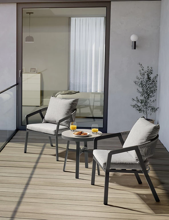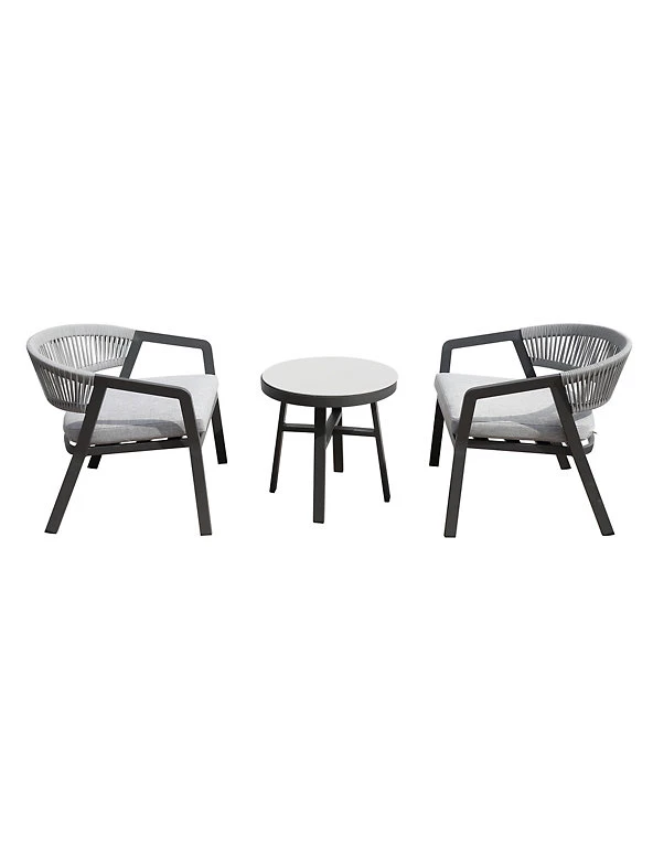 Upgrade your outdoor space with this garden furniture from the Cassis range. This stylish set includes two lounge chairs and a side table – both with hardwearing aluminium frames. The cushioned chairs feature chic rope weave detailing and the round table has a glass top for a smart finish.