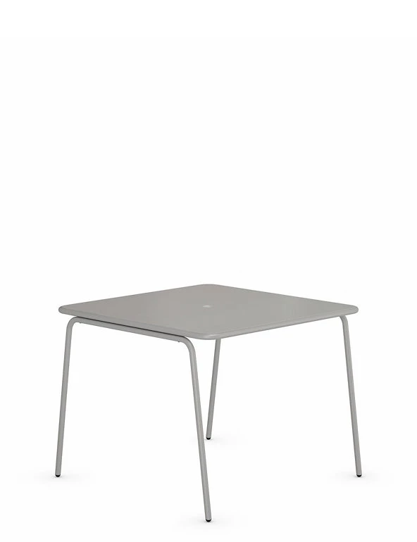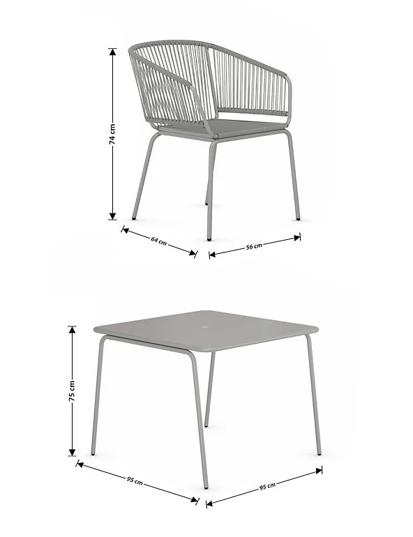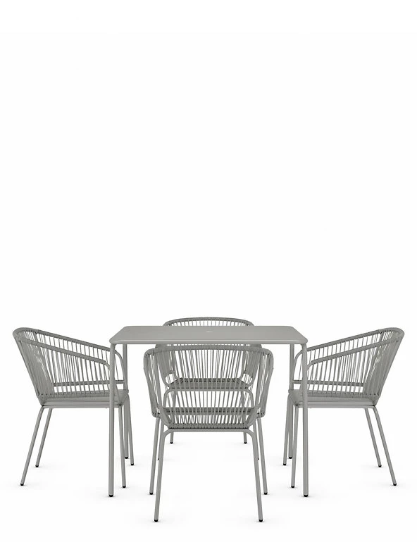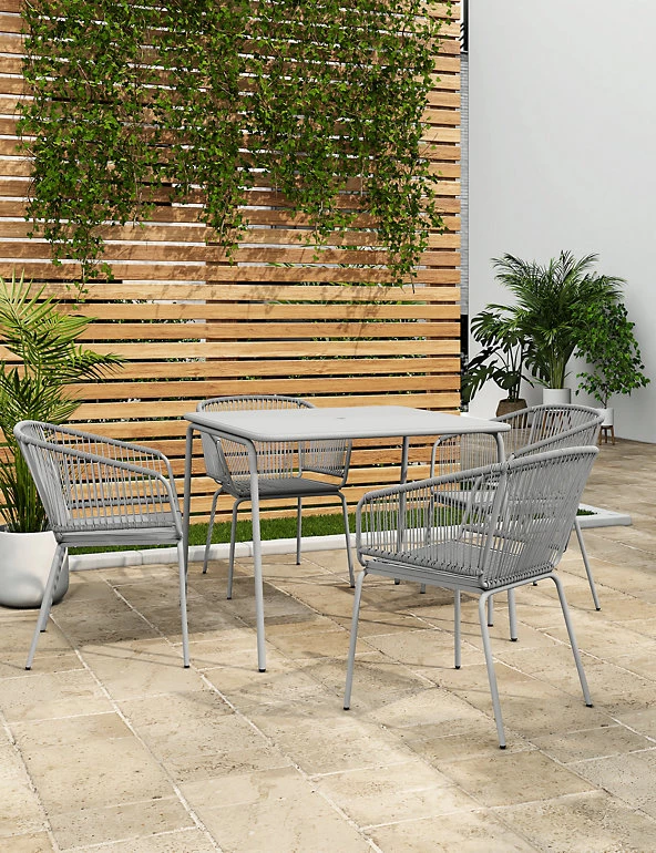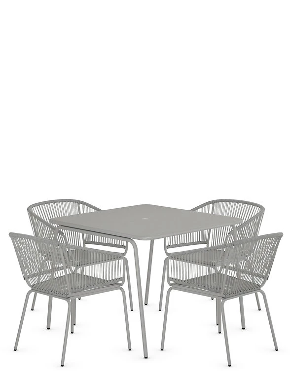 Create a relaxing outdoor dining space with our Lois table and chairs. This stylish set includes a table and four curved matching chairs. A powder coating adds a protective finish to this metallic design.