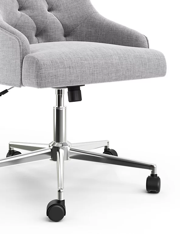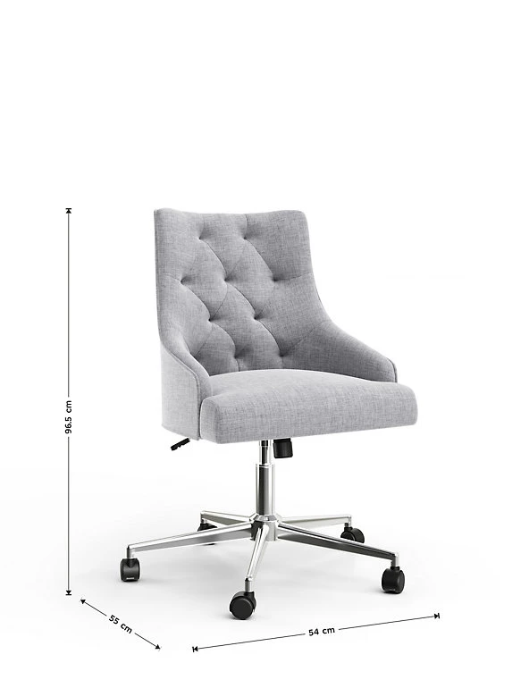 With its pinched back detail, the Jones office chair makes a plush addition to your workspace. Its padded seat and gently curving armrests ensure you’re comfortable as you work. The seat is set on a chrome swivel-tilt base and four wheeled feet, so you can move effortlessly around your office.