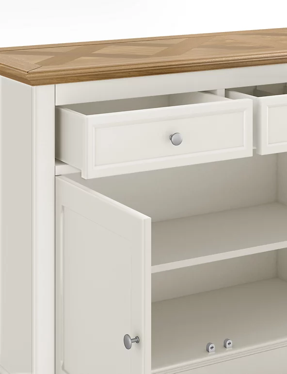 Combining a timeless aesthetic with ample storage, this three-door sideboard from our Greenwich collection makes an elegant yet practical addition to any room. There are three drawers for organising smaller items, and behind the soft-close doors you’ll find generous storage space with an internal shelf. Bevelled trims and textured metal handles add to the refined finishing details.