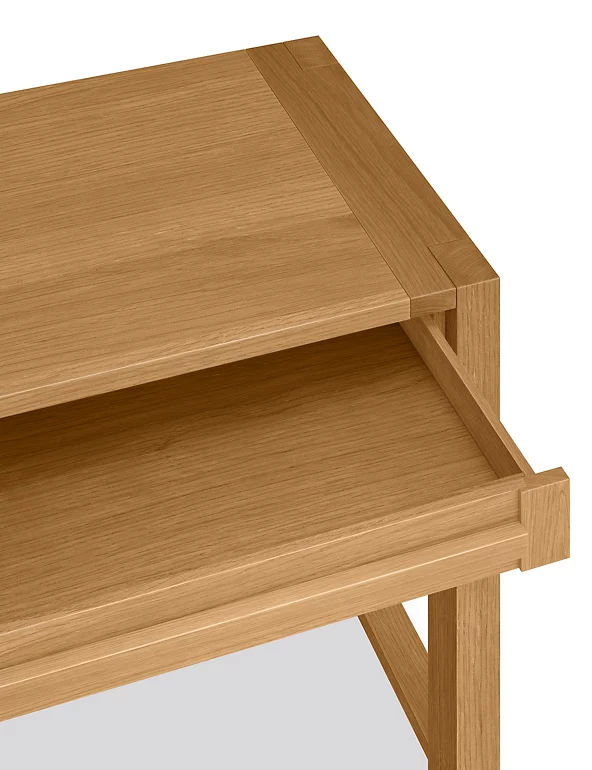 Simple yet elegant, this Sonoma™ desk provides a no-fuss solution for when you need to work or study from home. We’ve built this wooden desk from predominately solid oak and oak veneer to give a bright yet subtle feel that complements a wide variety of spaces. The pull-out drawer with fold-down front is the perfect place for a keyboard, and we’ve finished this desk with a low-sheen lacquer for added durability so you can use this workspace year after year.